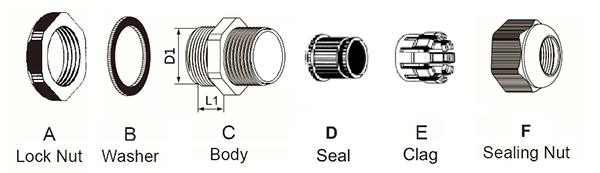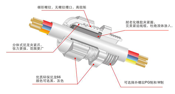 产品特性:特殊夹紧爪与夹紧圈分体设计,夹紧电缆范围大,抗拉力特强,可防水、防尘、抗盐、耐弱酸、酒精、油、油脂及一般溶剂。